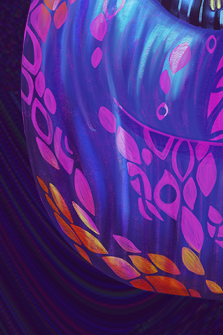 No estaba muy segura del sombrero, al final se quedó, esta pieza también tuvo varios pases, no me encantaba la piel y la túnica un explorar de texturas, siento que esta parecen como escamas y ojos, me encanta. Una de las cosas que aprecio de las personas es que puedan escuchar, y siento que esta ballena lo está haciendo con este pez.